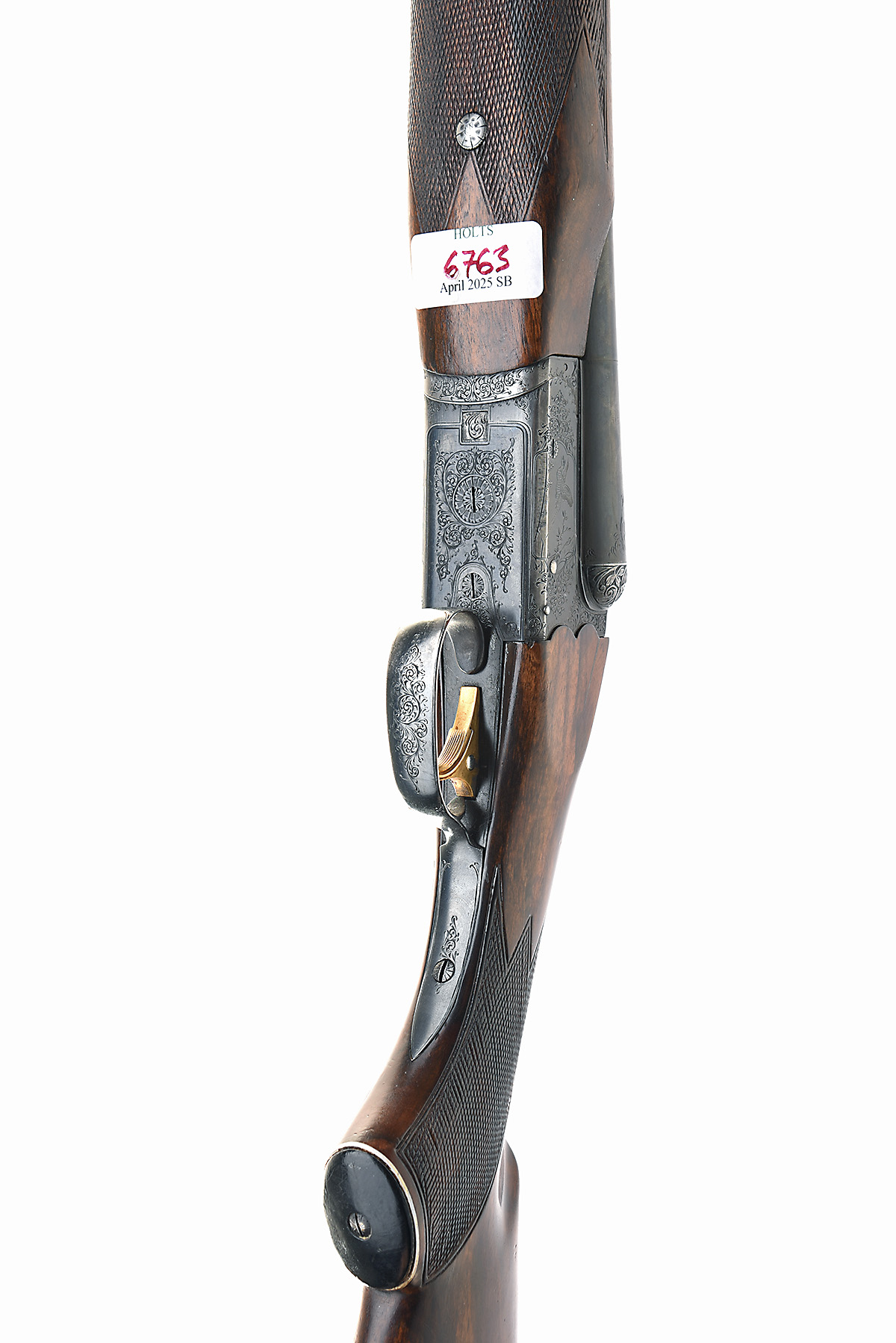 SKB 12-BORE 'BSA 200' SINGLE-TRIGGER BOXLOCK EJECTOR, serial no. circa 1970, 28in. nitro barrels, 2 3/4in. chambers, bored approx. 1/4 and 3/4 choke, scroll-back action, automatic safety, gold-washed trigger with barrel selector switch, border and acanthus scroll engraving with game scene vignettes, 14 1/4in. pistolgrip stock (crack at head) including buttplate, weight 7lb. 3oz.