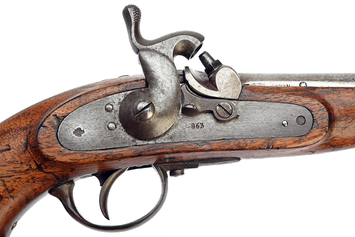 A CONTINENTAL 14mm PERCUSSION RIFLED HOLSTER-PISTOL, serial no. 863, probably Austrian and dating from 1863, with tapering round 10 1/2in. barrel possibly signed 'THISFDERL', bar-action lock with swing dog safety, walnut half-stock with heavy iron furniture and no provision for ramrod