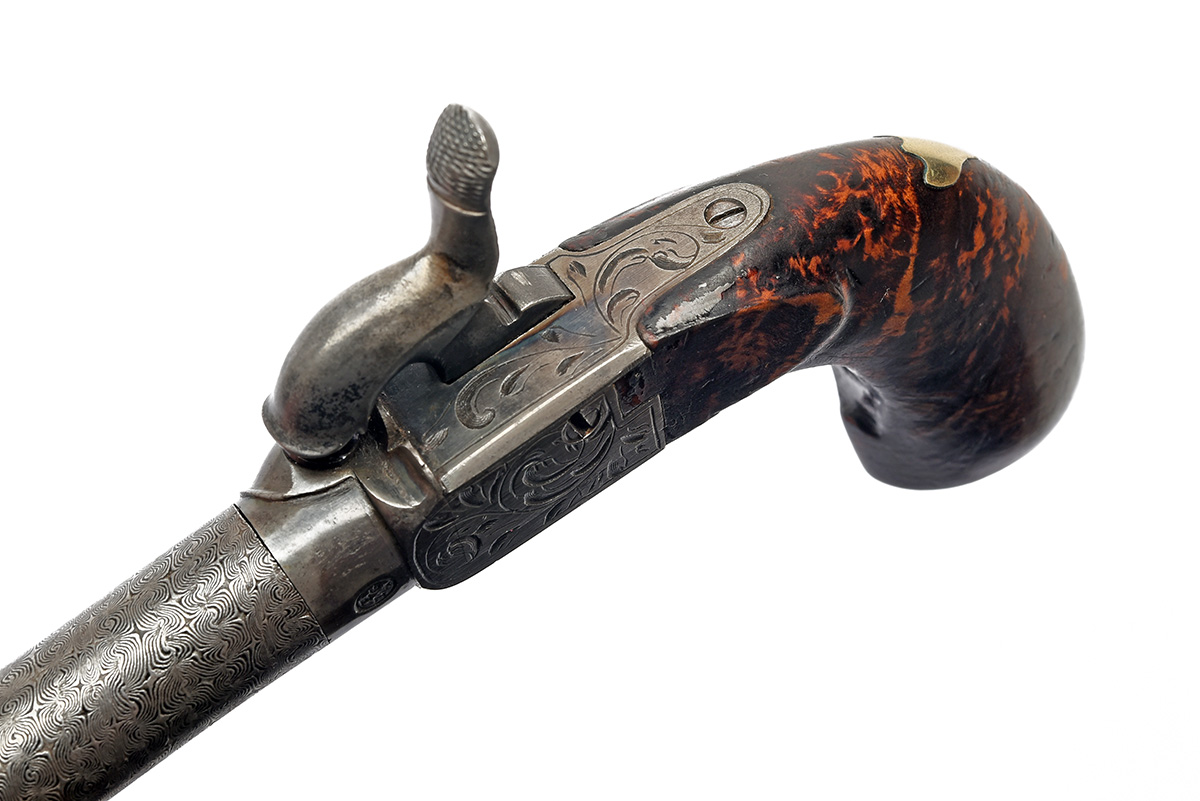 A 40-BORE PERCUSSION MICRO-RIFLED MUFF-PISTOL, UNSIGNED, no visible serial number, in a later case, with turn-off etched damascus 2in. barrel, engraved boxlock action with central hammer and concealed automatic trigger, burr wood grip with white metal trap at heel, in a later wood box
