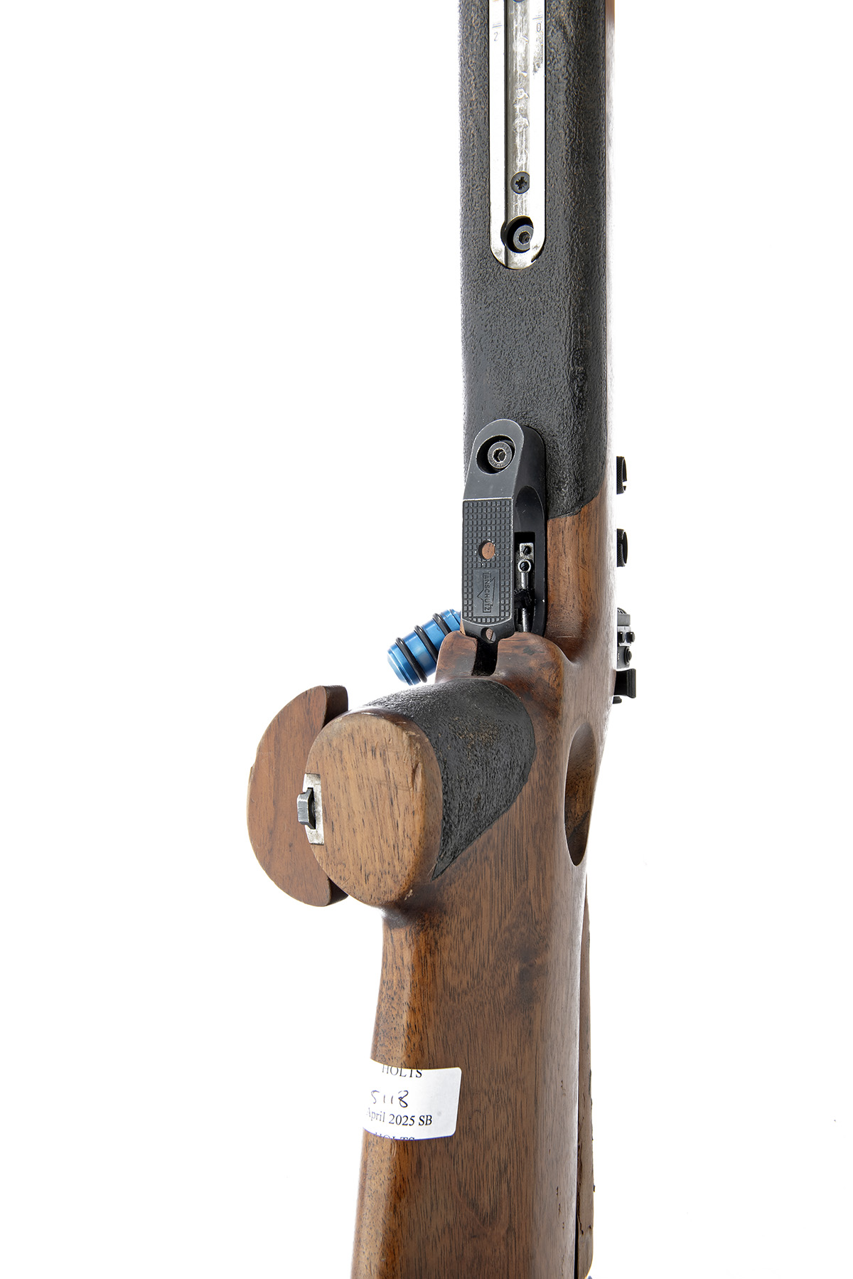 for 1969, 26in. nitro barrel, tunnel fore-sight (detached), rear Anschutz aperture sight, manual safety (not functioning), adjustable trigger, thumbhole adjustable stock with adjustable aluminium hook butt