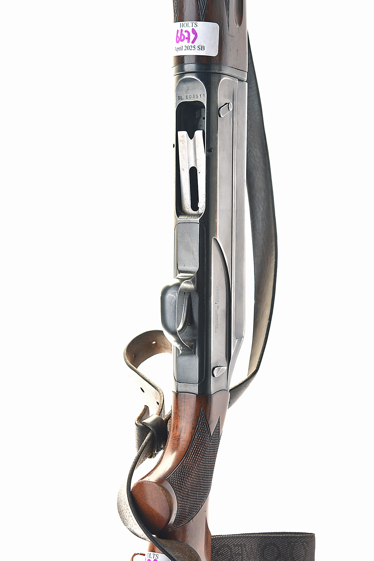 BREDA 12-BORE SEMI-AUTO SHOTGUN, serial no. SL603511, for 1969, 24in. nitro barrel with 8mm raised ventilated matt rib, 2 3/4in. chamber, multichoke (with spares), barrel numbered BV260783, manual sidelever safety, blued finish, 14in. pistolgrip stock including buttplate, leather sling, weight 7lb. 2oz.