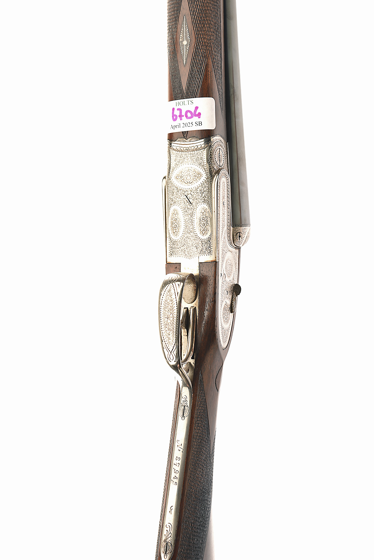 for 1981, 27in. nitro chopperlump barrels, the rib engraved 'BLACK POINT DE LUXE', 2 3/4in. chambers, bored approx. imp. cyl. and 1/4 choke, treble-grip action with hidden third-bite, removable striker discs, automatic safety with engraved 'S' detail, hand-detachable sidelocks, cocking indicators, articulated front trigger, acanthus scroll and floral bouquet engraving, bright finish, 14 3/4in. stock, applied rubber boot recoil pad, weight 6lb. 10oz.