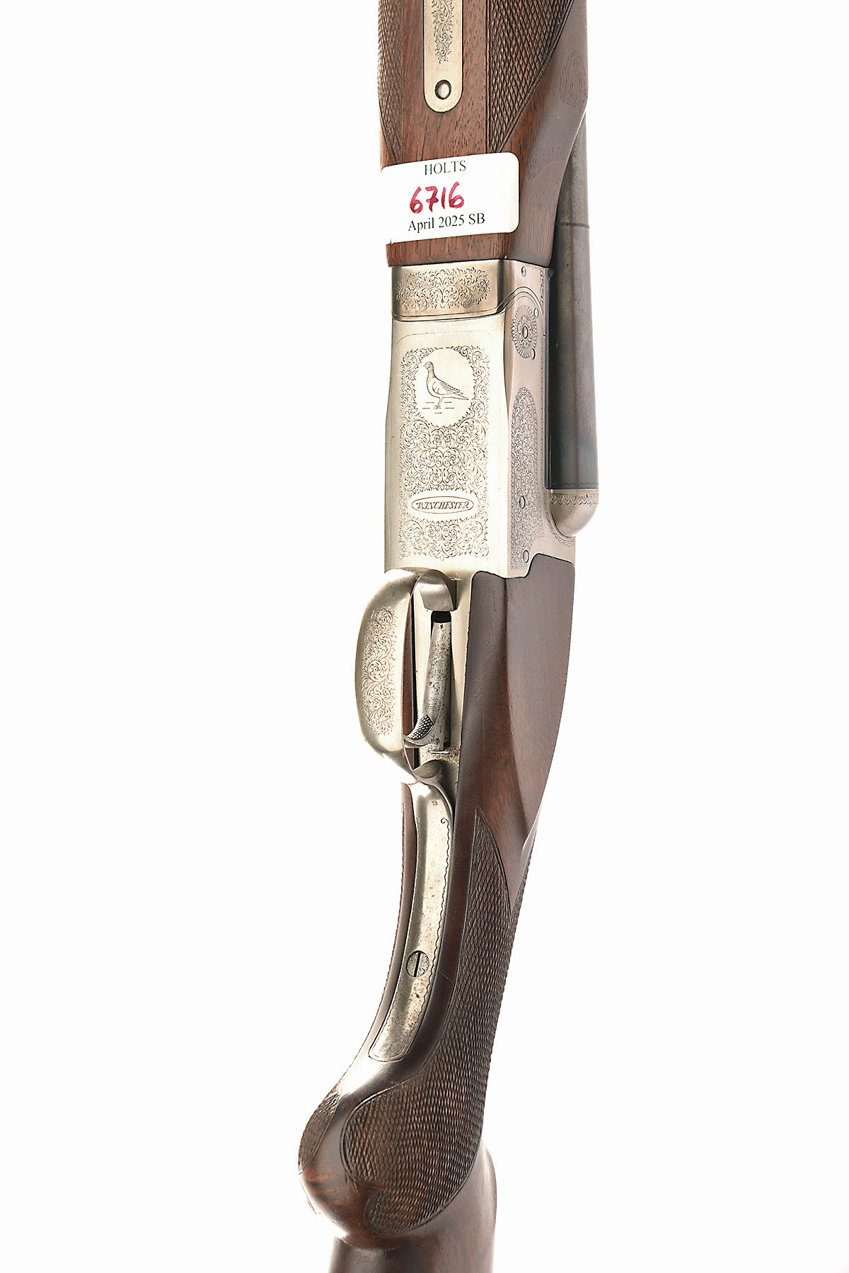 WINCHESTER 12-BORE 'PIGEON GRADE MODEL 23 XTR' SINGLE-TRIGGER BOXLOCK EJECTOR, serial no. PWK009422E, circa 1983, 28in. nitro barrels with ventilated rib, 3in. chambers, bored approx. imp. cyl. and 1/2 choke, automatic safety with integral barrel selector switch, scroll engraving, the underside with a pigeon, silver finish overall, 14 1/2in. semi-pistolgrip stock (cracked at hand) including 5/8in. extension, beavertail fore-end, weight 7lb. 4oz.