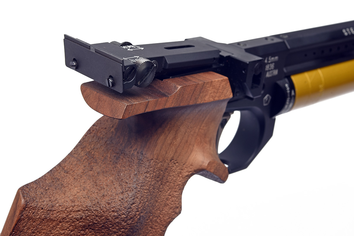 A CASED .177 STEYR MATCH LP5 PRE-CHARGED PNEUMATIC AIR PISTOL, serial no. 803836, with shrouded 9 1/4in. barrel, micro adjustable sights, aperture for magazine (three included), anatomical right hand walnut grip and gold-coloured air-reservoir (with spare), in an abs plastic case with further accessories (untested)