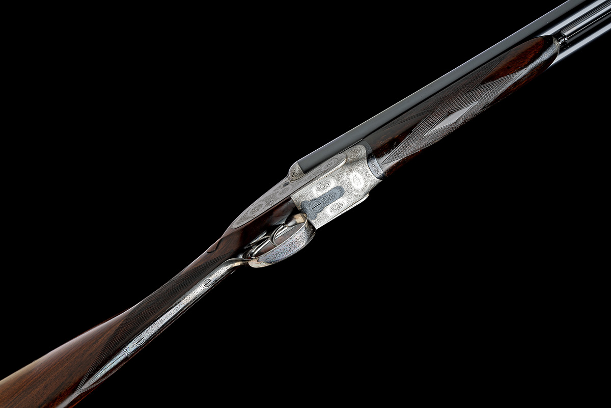 for 1900, 30in. nitro barrels, the rib engraved 'J. PURDEY & SONS. AUDLEY HOUSE. SOUTH AUDLEY STREET. LONDON. MADE OF SIR JOSEPH WHITWORTH'S FLUID PRESSED STEEL.' and '1' and acanthus scroll detailing, 2 1/2in. chambers, bored approx. 1/4 and 3/4 choke, toplever engraved '1', removable striker discs, automatic safety with gold-inlaid 'SAFE' detail, arrow cocking-indicators, articulated front trigger, fine acanthus scroll engraving with floral bouquets, brushed bright and reblued finish overall, 14 1/4in. figured stock including horn buttplate, weight 6lb. 10oz.