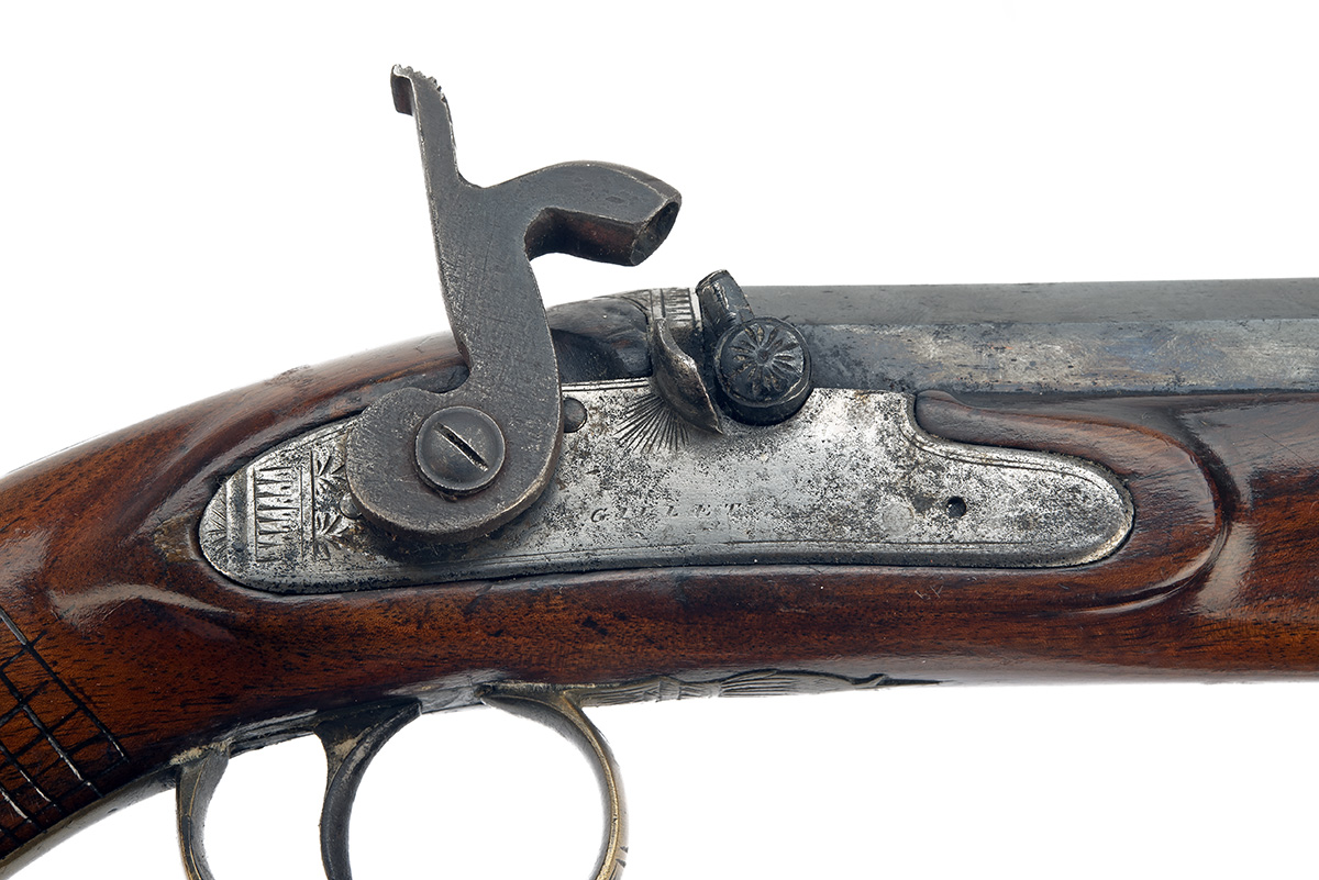 A .750 PERCUSSION MANSTOPPER PISTOL SIGNED GILLET, no visible serial number,