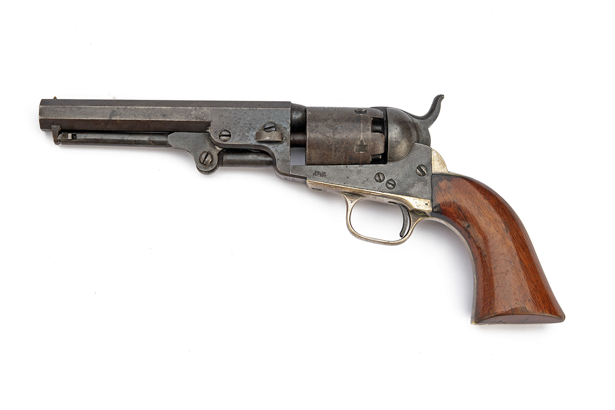 for 1854, with octagonal 5in. barrel signed on two lines 'ADDRESS SAML. COLT' over 'NEW YORK CITY', open iron frame (slight traces of colour, trigger return spring at fault)), plain roll engraved six-shot cylinder, silver-plated brass grip-straps and trigger guard (much plating remaining), smooth flared walnut grip, all matching numbers including wedge, in a period case relined in dark red felt and including a reproduction flask, an original iron Colt mould with sprue-cutter and caps