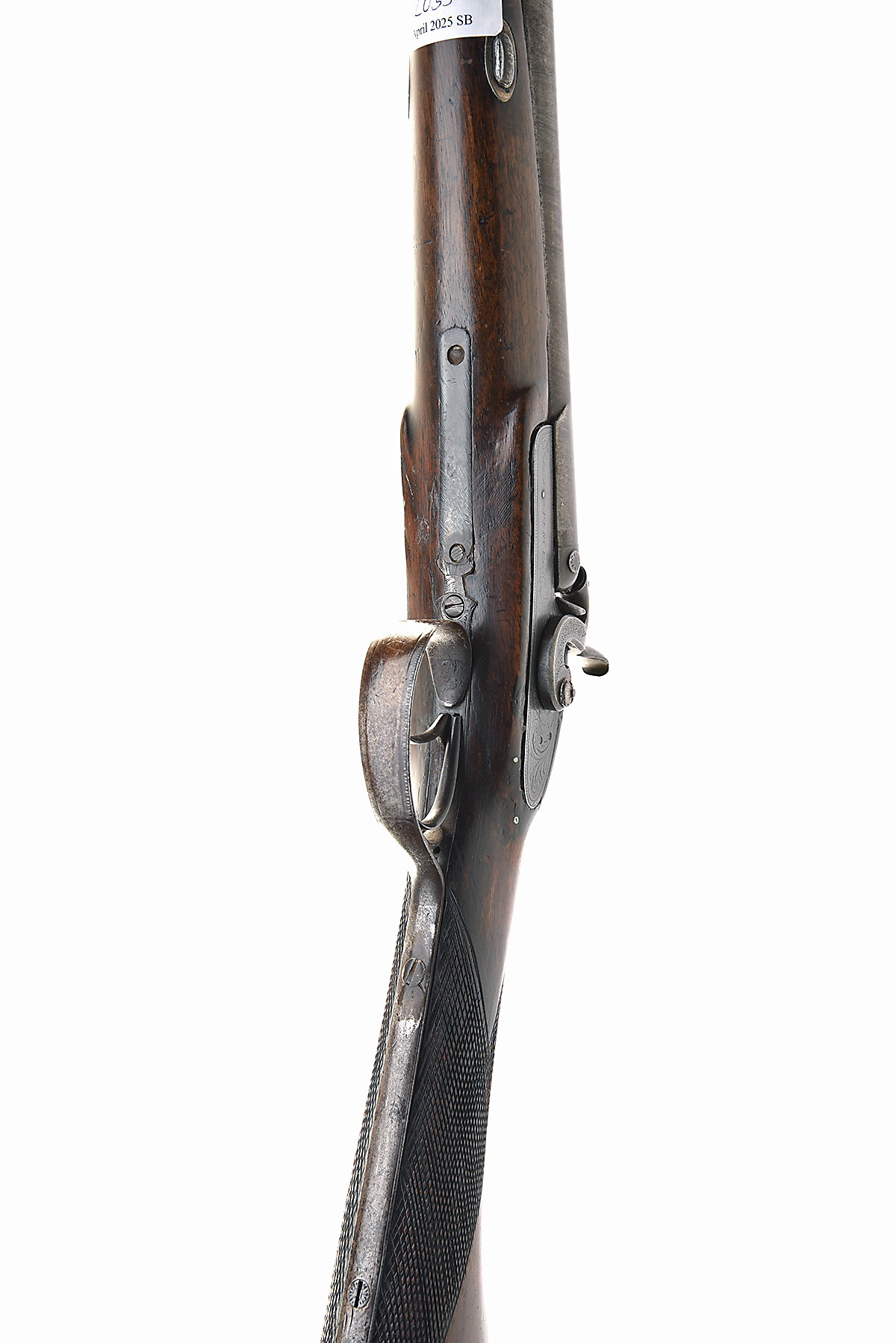 A 12-BORE PERCUSSION DOUBLE-BARRELLED SPORTING-GUN SIGNED PERCY, no visible serial number,