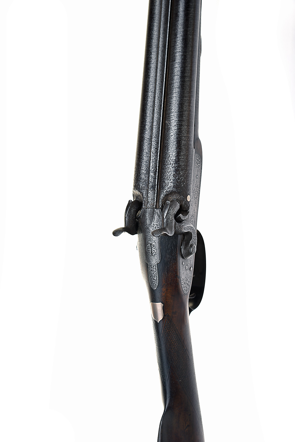A 12-BORE PERCUSSION DOUBLE-BARRELLED SPORTING-GUN SIGNED KEW, LOUTH, no visible serial number, circa 1855, with 30 1/2in. barrels (pitted externally at breech, border and scroll engraved bar-action locks signed 'KEW, LOUTH', chequered walnut half-stock (worn), replacement ramrod