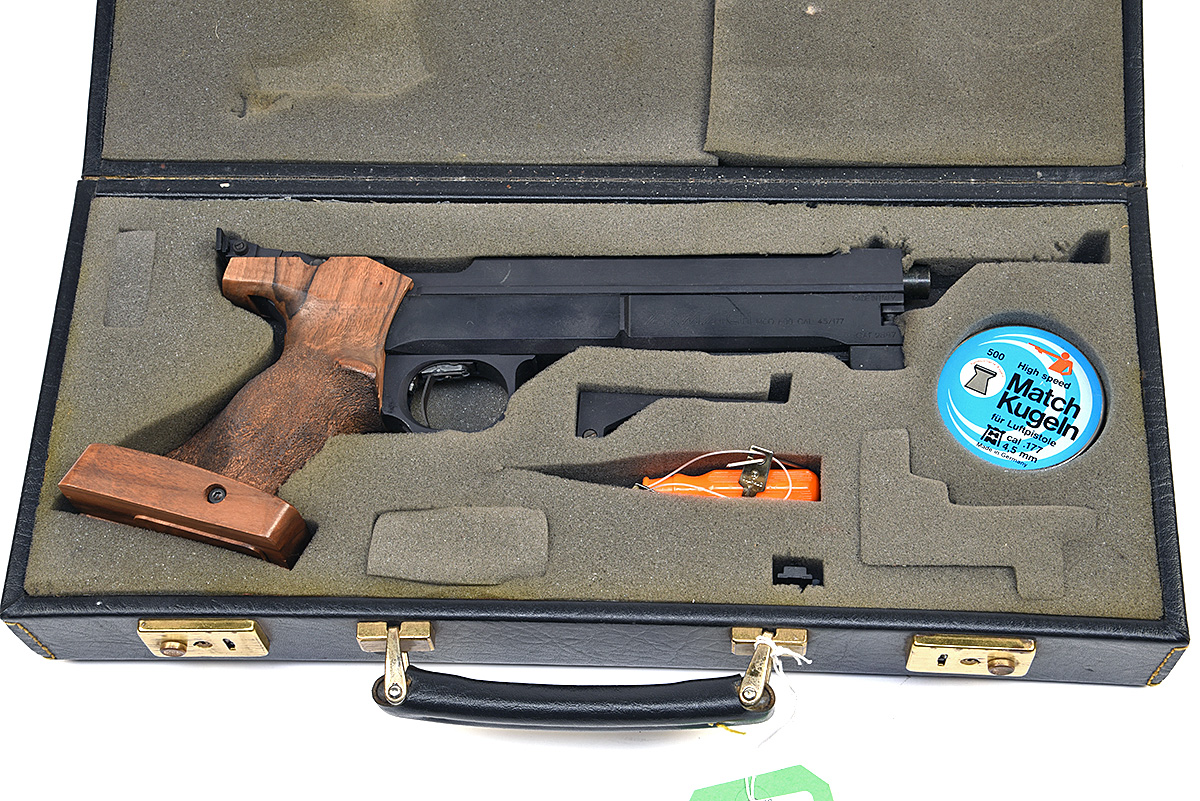 A CASED .177 AIR MATCH MODEL 600 SINGLE-STOKE PNEUMATIC AIR-PISTOL, serial no. 54189, with square shrouded 7 1/2in. barrel, side-lever cocking, micro adjustable sights and anatomical walnut grip, in its maker's vinyl covered case with accessories