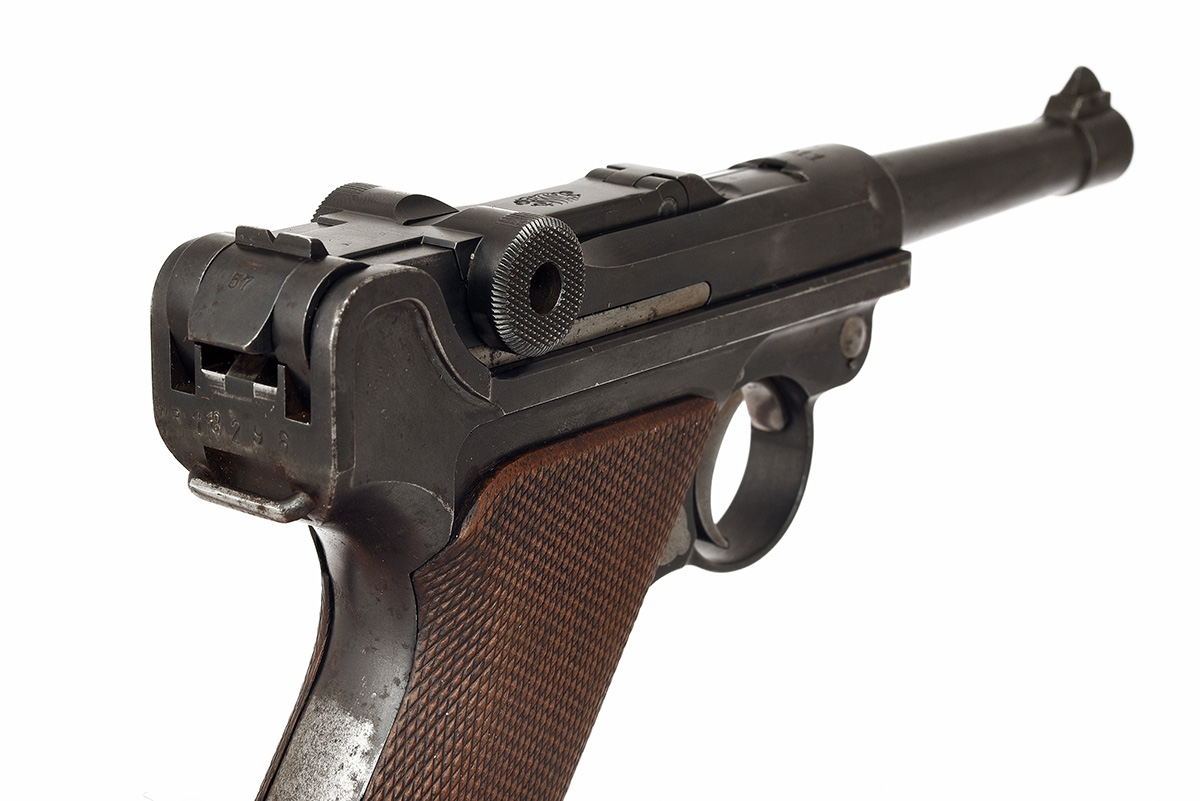dated for 1911, with 4in. sighted barrel, receiver bridge with date, 'DWM' monogram to toggle, butt with no provision for shoulder-stock, the back-strap stamped 'L.P. 327' (rubbed), South African registration number to back of frame behind toggle, much straw finish to ancillaries, chequered wood grips, all matching numbers including wood-based magazine, the whole with a strong amount of original finish remaining, together with a tan leather holster for same, a further matching number magazine, a stripping/loading tool and a certificate of proof dated 2025