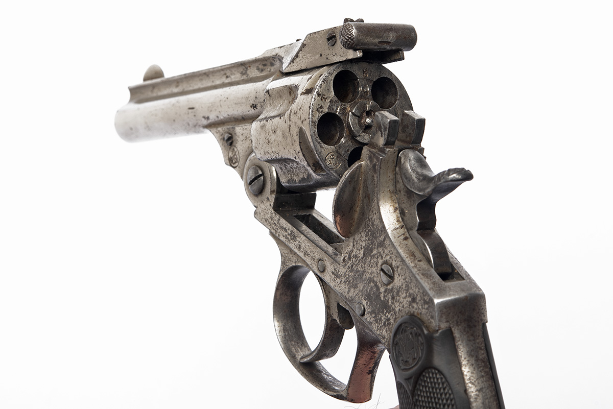 circa 1890, with round 3 1/2in. barrel, moulded integral sighting rib signed 'SMITH & WESSON, SPRINGFIELD MASS PAT. * * * * NOV. 24. 63' (remainder obscured), crescent fore-sight, rear-sight to the lift-up barrel latch, break-open frame with automatic ejecting five-shot cylinder, the ejector-housing stamped with a 'bee' trademark, double action mechanism (slightly at fault), chequered hard rubber grips embossed with the 'S&W' trademark and square-backed trigger guard, fair amount of nickel-plated finish remaining