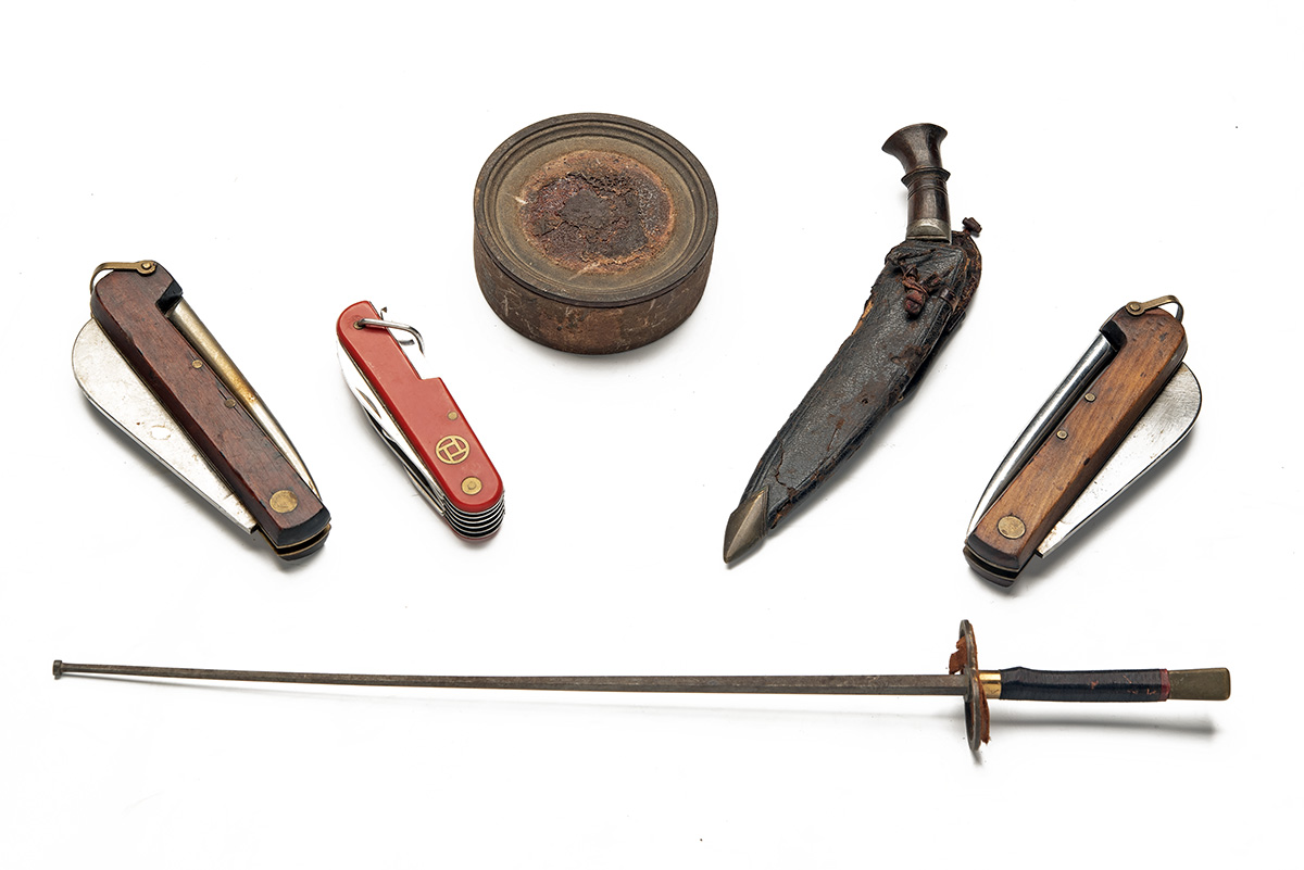AN ECLECTIC MIX OF 10 ITEMS, MAINLY EDGED WEAPONS, being 1) a No. 4 Mk II spike bayonet for the SMLE; 2) a French Model 1866 bayonet; 3) a Swiss army knife style multi-tool; 4&5) x2 folding sailor's knives by Atlanta; 6) a small tourist Kukri complete with both skinning knives in a black leather scabbard; 7) a miniature foil, 13 1/2 in. total length; 8) a carved wooden south sea island tourist knife-club; 9) a horn-handled tourist horse-tail fly whisk; 10) a circa 18th Century pot of unknown use (10)