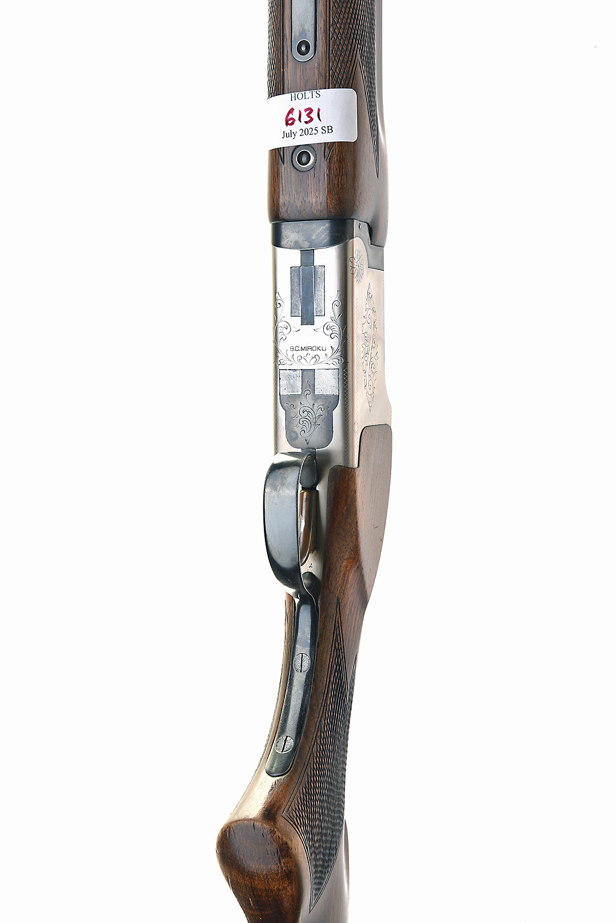 B.C. MIROKU 12-BORE SINGLE-TRIGGER OVER AND UNDER EJECTOR, serial no. 2221401, circa 1977, 26in. nitro barrels with 8mm ventilated matt top-rib, 2 3/4in. chambers, bored approx. 1/4 and 1/2 choke, hold-open toplever, automatic safety with integral barrel selector switch, gold-washed single trigger, border and partial scroll engraving, satin finish, 14 1/2in. pistolgrip stock including 1/2in. recoil pad, weight 6lb. 12oz.