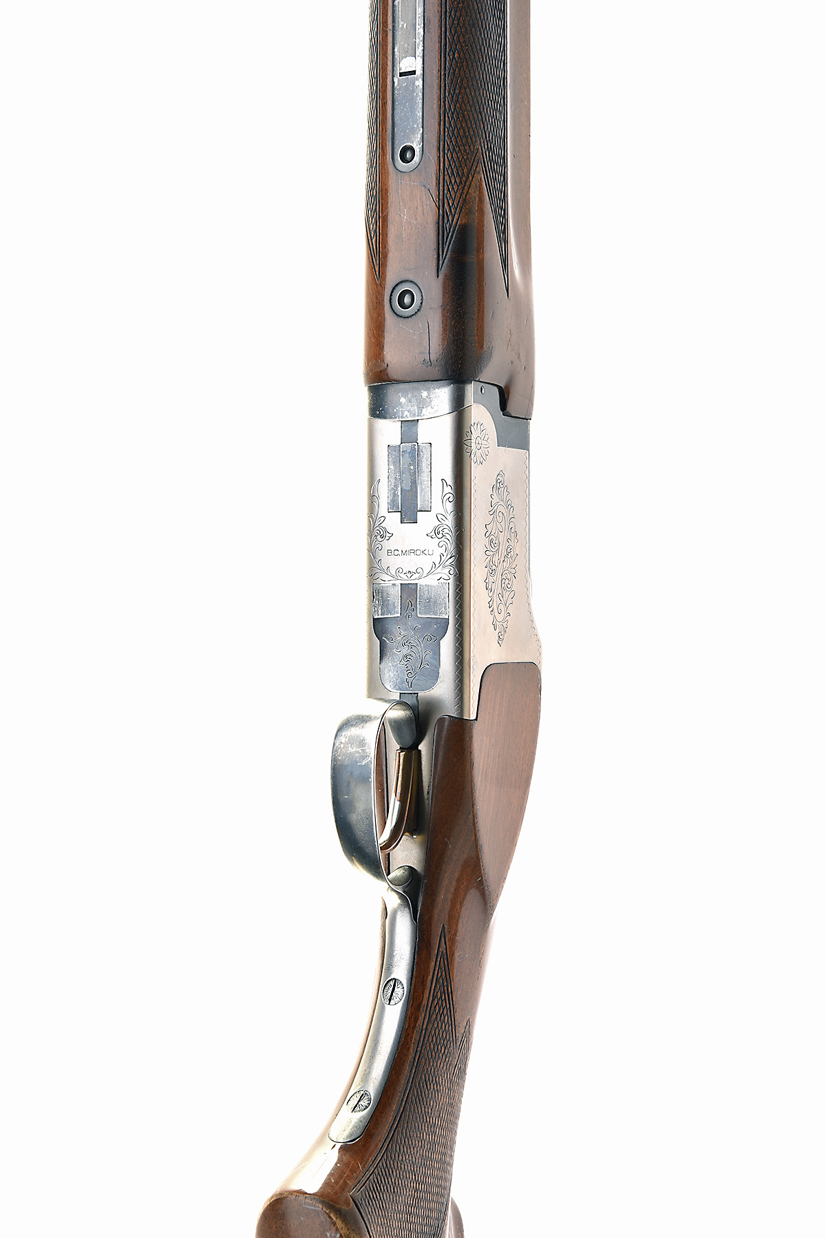 MIROKU FIREARMS MFG. CO. 12-BORE SINGLE-TRIGGER OVER AND UNDER EJECTOR, serial no. 3322816, circa 1980, 28in. nitro barrels with 8mm ventilated matt top-rib, 2 3/4in. chambers, bored approx. 1/4 and full choke, hold-open toplever, hold-open toplever, automatic safety with integral barrel selector switch, gold-washed single-trigger, border and partial scroll engraving, 14 1/4in. pistolgrip stock including buttplate, weight 7lb.