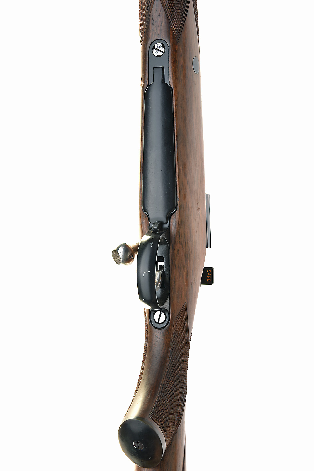 JOHN DICKSON & SON. .270 WIN. BOLT-MAGAZINE SPORTING RIFLE, serial no. 74173, circa 1975, 21 1/4in. nitro reproved barrel (in 2026), threaded muzzle with thread cap, open rear sight with two folding leaf sights, marked for 100, 200 and 300 yards, engraved 'JOHN DICKSON & SON. 21 FREDERICK STREET. EDINBURGH.' and 'CALIBRE .270', receiver with thumb cut-out, drilled on for scope mount bases, with screw blanks fitted, manual colour-hardened flag safety with gold-inlaid 'SAFE' detail, timney trigger, gold-washed magazine lifter, hinged floorplate, pistolgrip halfstock with horn pistolgrip cap and fore-end finial, cheekpiece, 15in. pull including rubber recoil pad, weight 8lb. 4oz.