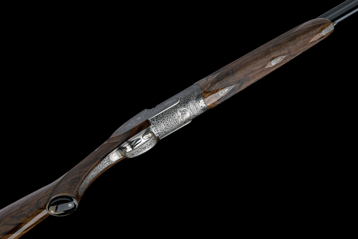 dated 2004, 29 1/4in. nitro barrels with 7mm solid matt top-rib, 2 3/4in. chambers, bored approx. 1/2 and 3/4 choke, hold-open toplever, automatic safety with gold-inlaid 'SAFE' detail and integral triggerplate release catch, action, furniture and decorative sideplates engraved with acanthus scrollwork set against a matt background interspersed with vignettes of woodcock, partridge and mallard, with the makers name within an elaborate cartouche, the model designation engraved on the fore-end iron in a similar cartouche, triggerplate signed 'Gobbi Inc.', silver finish, 15in. figured stock with pistolgrip-cap, weight 7lb. 1oz., in its makers universal case
