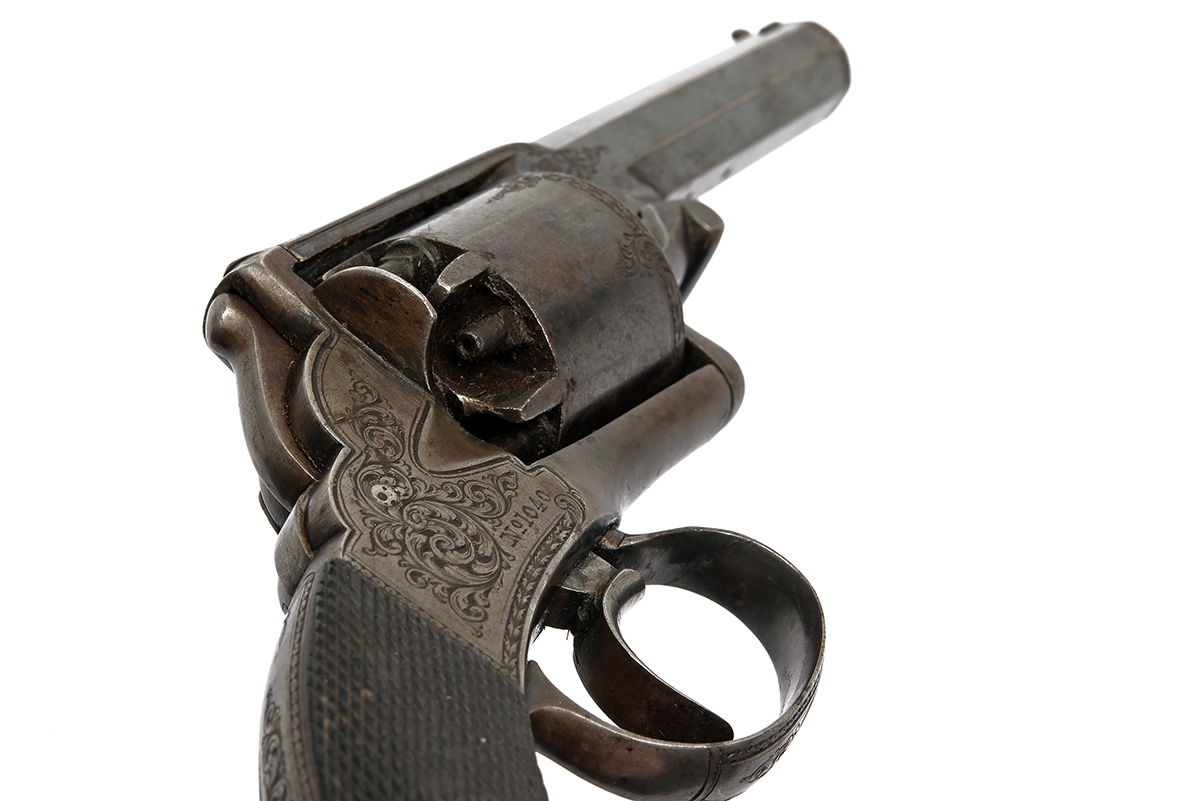 A 100-BORE PERCUSSION 6-SHOT WEBLEY BENTLEY REVOLVER, UNSIGNED, serial number 1040, circa 1860s, with 3 1/2 in. octagonal sighted barrel with side-mounted rammer, scroll-engraved frame with 'No.1040, cylinder with border-engraving, Birmingham proof-marks, scroll-engraved back-strap, butt-cap and trigger-guard, chequered black wooden grips, much original finish but action at fault, 8 in. overall length