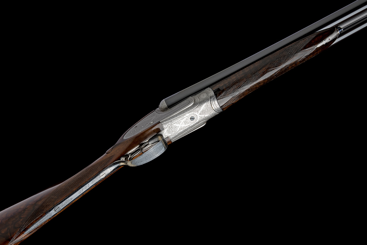 for 1901, 28in. replacement nitro barrels (in 1978), tubes engraved 'STEPHEN GRANT. 61. PALL MALL. ST. JAMES'S. LONDON.', 2 1/2in. chambers, bored approx. 1/4 and 3/4 choke, carved leaf fences, removable striker discs, slender toplever, automatic safety with gold-inlaid 'SAFE' detail, border and acanthus scroll engraving, brushed finish, 15 1/4in. highly-figured replacement pistolgrip stock, original fore-end wood with damage near knuckle, weight 6lb. 12oz.
