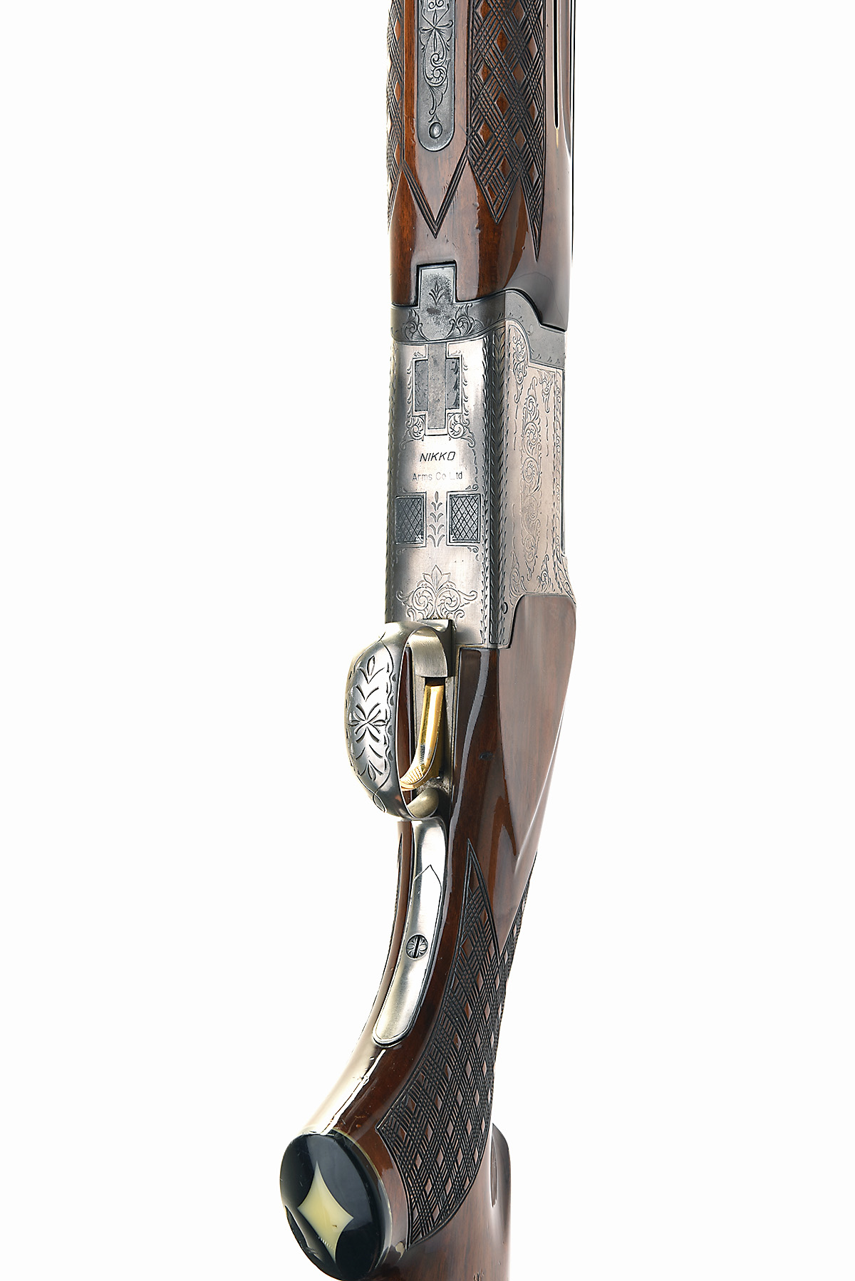 NIKKO ARMS CO. 12-BORE 'SHADOW' SINGLE-TRIGGER OVER AND UNDER EJECTOR, serial no. K705104, dated 1974, 29 3/4in. nitro barrels with iconic broad 20mm ventilated matt 'Airflow' top-rib, 2 3/4in. chambers, bored approx. 1/4 and 1/2 choke, hold-open toplever, manual safety with integral barrel selector switch, gold-washed single trigger, border and partial scroll engraving, silver finish, 14 1/4in. diamond chequered pistolgrip stock with pistolgrip cap, including 7/8in. rubber recoil pad, characteristic ventilated semi-beavertail fore-end with lined vents, weight 8lb. 3oz.