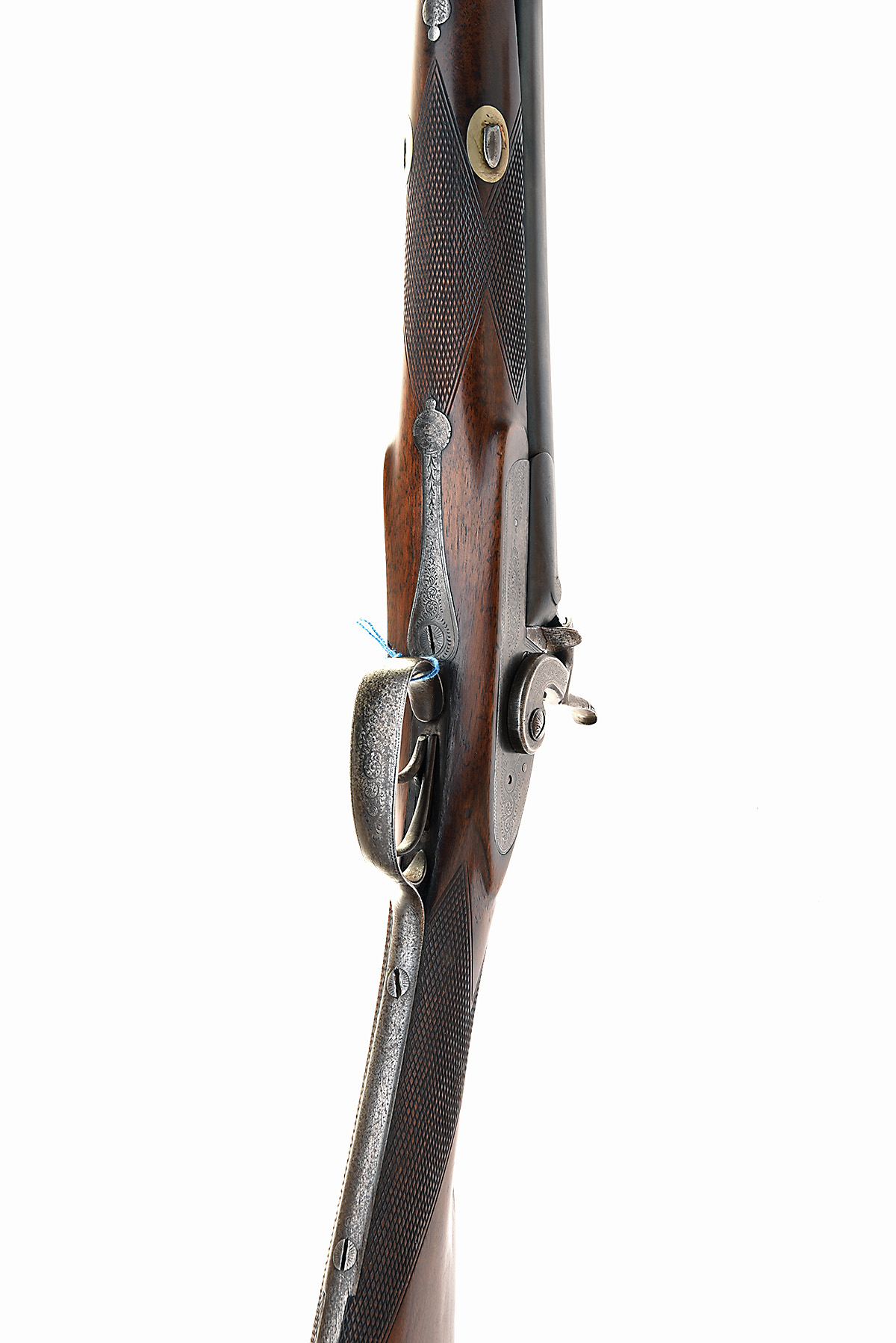 A 16-BORE PERCUSSION DOUBLE-BARRELLED SPORTING-GUN, UNSIGNED, no visible serial number, circa 1860, with reblued 30in. barrels, borderline and scroll engraved bar-action locks, chequered walnut half-stock, iron furniture and replacement ramrod