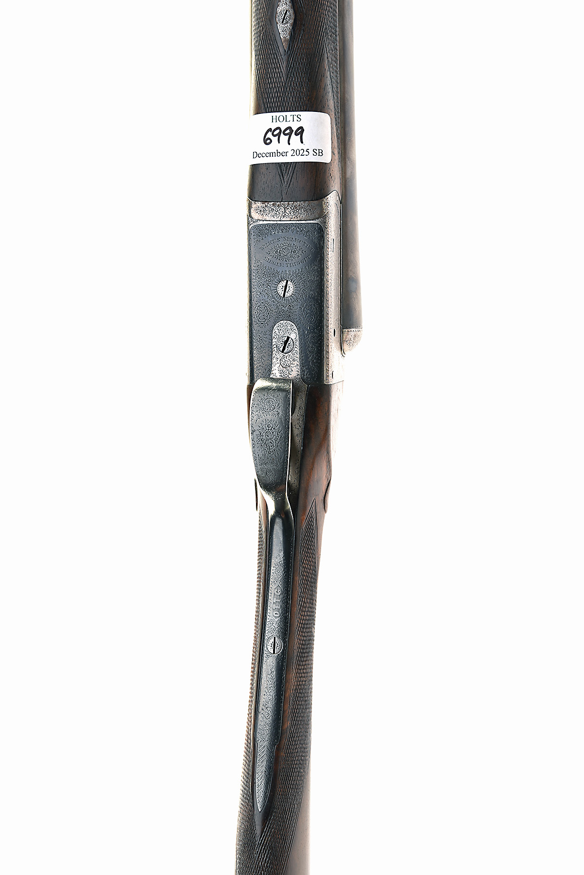 JOHN WILKES 12-BORE SELECTIVE SINGLE-TRIGGER BOXLOCK EJECTOR, serial no. 9110, circa 1915, 29in. nitro barrels, 2 1/2in. chambers, bored approx. true cyl. and full choke, treble-grip action with hidden third bite, automatic safety with gold-inlaid 'SAFE' detail, border and acanthus scroll engraving with floral bouquets, brushed finish, 15 1/4in. figured replacement stock including 7/8in. extension, weight 6lb. 10oz.