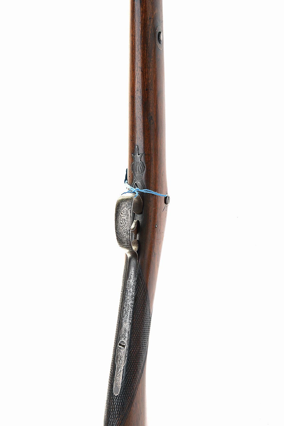 A 14-BORE PERCUSSION SINGLE-BARRELLED SPORTING-GUN MARKED ROWNTREE, no visible serial number, circa 1840, with octagonal to sixteen-sided to round 29 1/2in. barrel stamped 'ROWNTREE' on the top-flat, borderline and scroll engraved back-action lock, walnut half-stock chequered at the wrist and iron furniture, worm missing from ramrod