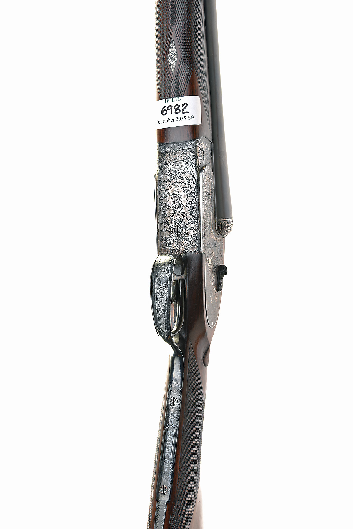 § ** AYA 12-BORE 'SHERWOOD' HAND-DETACHABLE SIDELOCK EJECTOR, serial no. 420968, dated 1974, 25in. nitro barrels with Churchill-rib, 2 3/4in. chambers, bored approx. true cyl. and imp. cyl. choke, removable striker discs, automatic safety, hand-detachable lockplates, gold-inlaid cocking-indicators, articulated front trigger, rolled-edge triggerguard, bold floral scroll engraving, retaining much original colour-hardening and finish, 14 3/4in. stock, weight 6lb. 11oz.