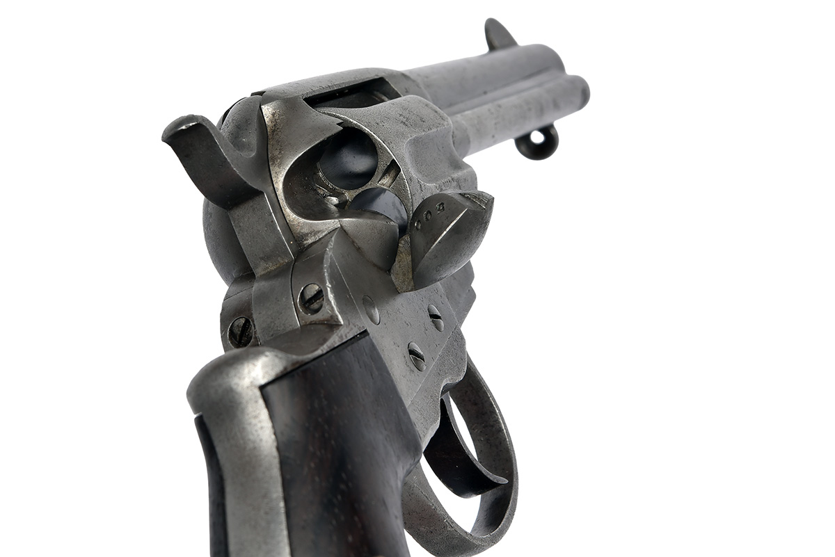 for 1902, with round 4 1/2in. barrel signed 'COLT'S PT. FA. MFG CO. HARTFORD CT. U.S.A.' on two lines along the top, crescent fore-sight, top-strap with full-length sighting groove, solid frame, fluted six-shot cylinder, double action mechanism, smooth walnut birdshead grips and under-barrel ejector-rod with bullseye thumb-piece, the whole cleaned of finish