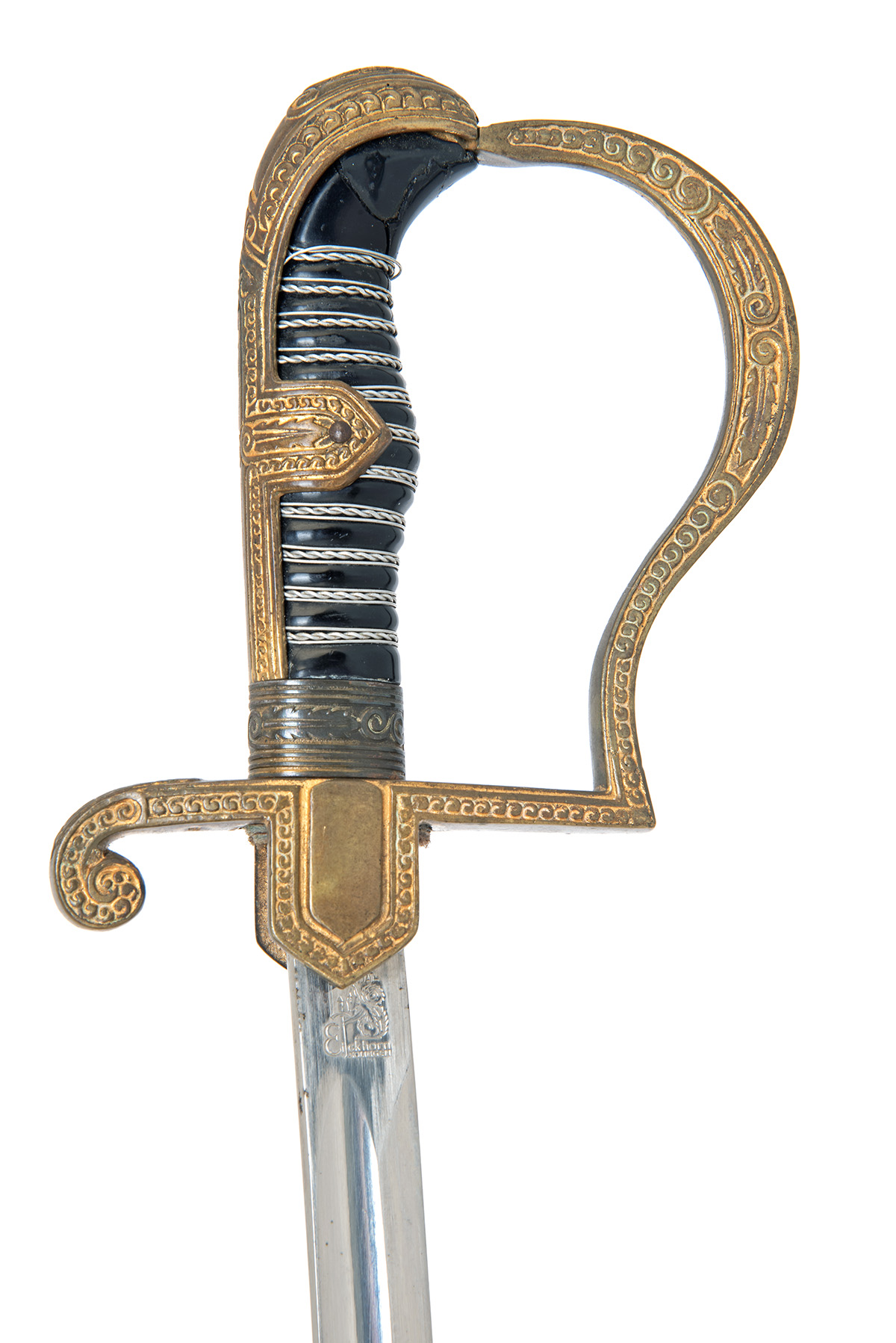 circa 1940, with 33in. slightly curved, single-edged nickelled blade fullered on each side, ricasso with Eickhorn Solingen squirrel and sword mark, gilt brass hilt with knuckle-bow, quillioned cross-guard stamped 'GES GESCH', front langet with eagle and swastika emblem, eared back-strap, wire-bound black celluloid grip (some cracking and loss to the top of the celluloid), blackened steel scabbard with suspension loop