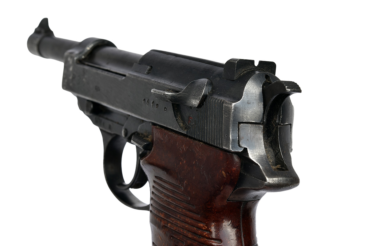circa 1944, with blued exposed 4 7/8in. barrel, blade fore-sight, open slide with the model designation, German manufacturer's code 'cyq' for Spreewerk and waffenampt stamps, steel frame, horizontally grooved brown bakelite grips, later Walther magazine, much original wartime finish, with a certificate of proof