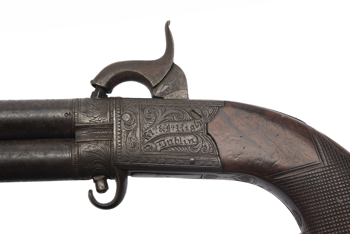 circa 1840, the post 1843 registration number for Tipperary (North Riding), plain turn-off 1 3/4in. barrels starred at the muzzle for a key (absent), engraved bands at join, engraved and moulded breeches, nipple guard below, border and acanthus scroll engraved slightly radiused action signed on the left 'WM. & J. RIGBY, DUBLIN' within banners, the right with a dog-headed feathered serpent within a field of scrolls, replacement hammer, finely chequered walnut bag-shaped butt with white metal oval escutcheon at pommel, concealed automatic trigger