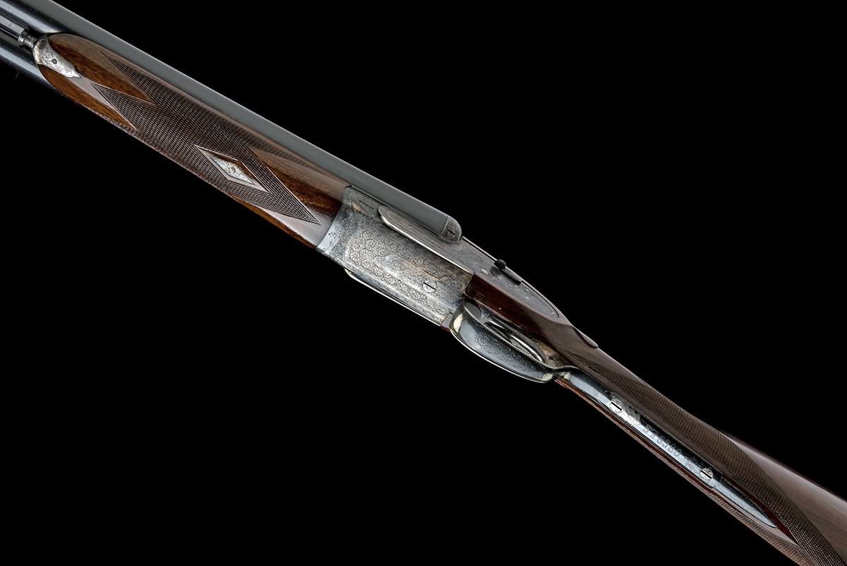 for 1984, 28in. nitro chopperlump barrels, 2 3/4in. chambers, bored approx. 1/4 and 3/4 choke, engraved arcaded fences, removable striker discs, automatic safety, hand-detachable lockplates, gold-inlaid cocking-indicators, articulated front trigger, rolled-edge triggerguard, acanthus scroll engraving, retaining much original colour-hardening and finish, 15 3/4in. stock, weight 7lb. 4oz.