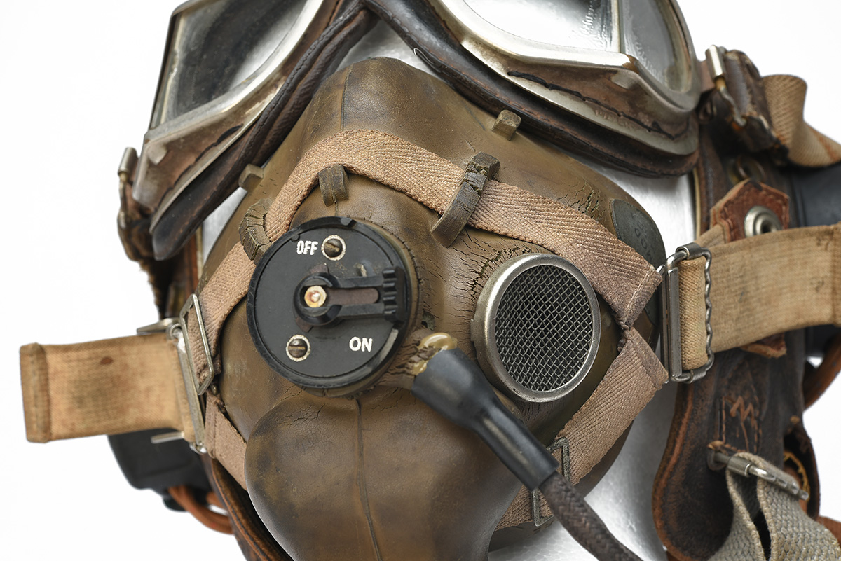 circa 1943, comprising a 2nd Pattern C-Type Flying Helmet, impressed with Air Ministry 'A crown M' to right flap, 10A/13466 receivers with 'A crown M' panels, pattern H Type oxygen mask with hose and clip (some deterioration in the rubber where the throat mic joins the mask), plus a pair of RAF MK VIII flying goggles