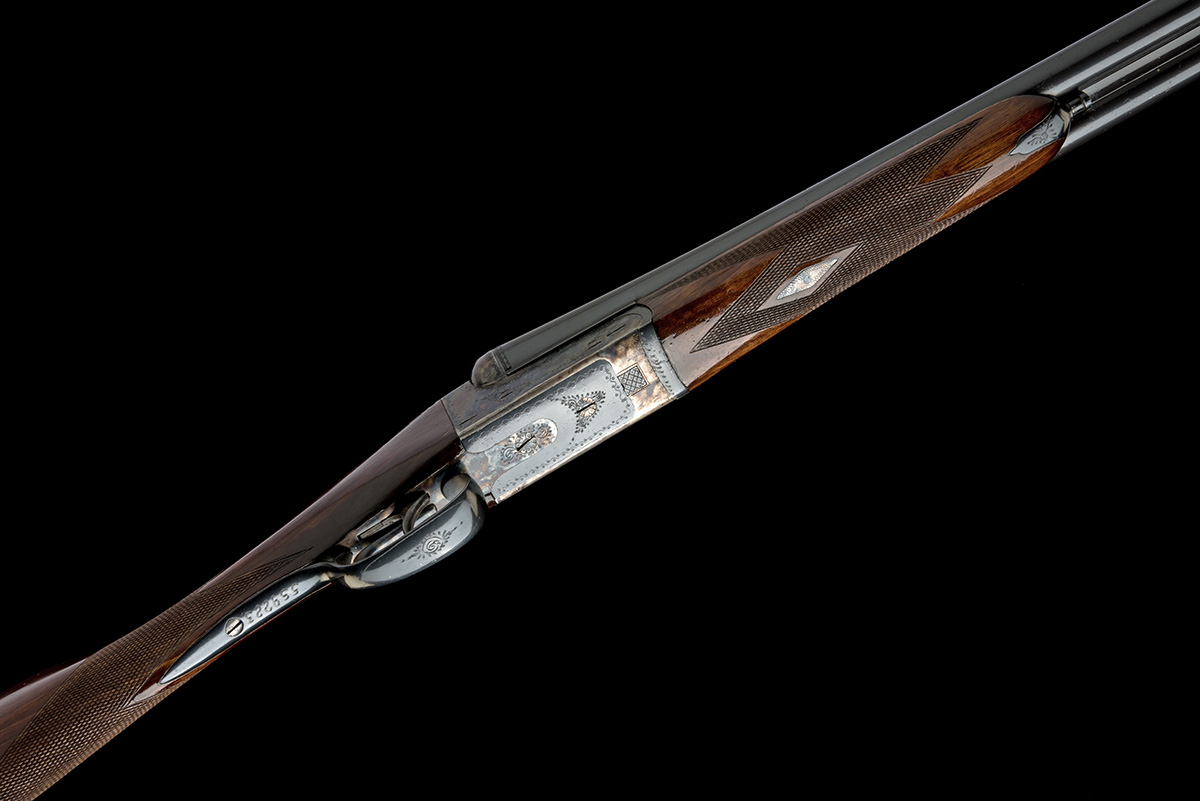 for 1981, 27in. nitro chopperlump barrels, 2 3/4in. chambers, bored approx. 1/4 and 3/4 choke, automatic safety, removable striker discs, border engraving, retaining much original colour-hardening and finish, 14 1/2in. stock, weight 5lb. 12oz.