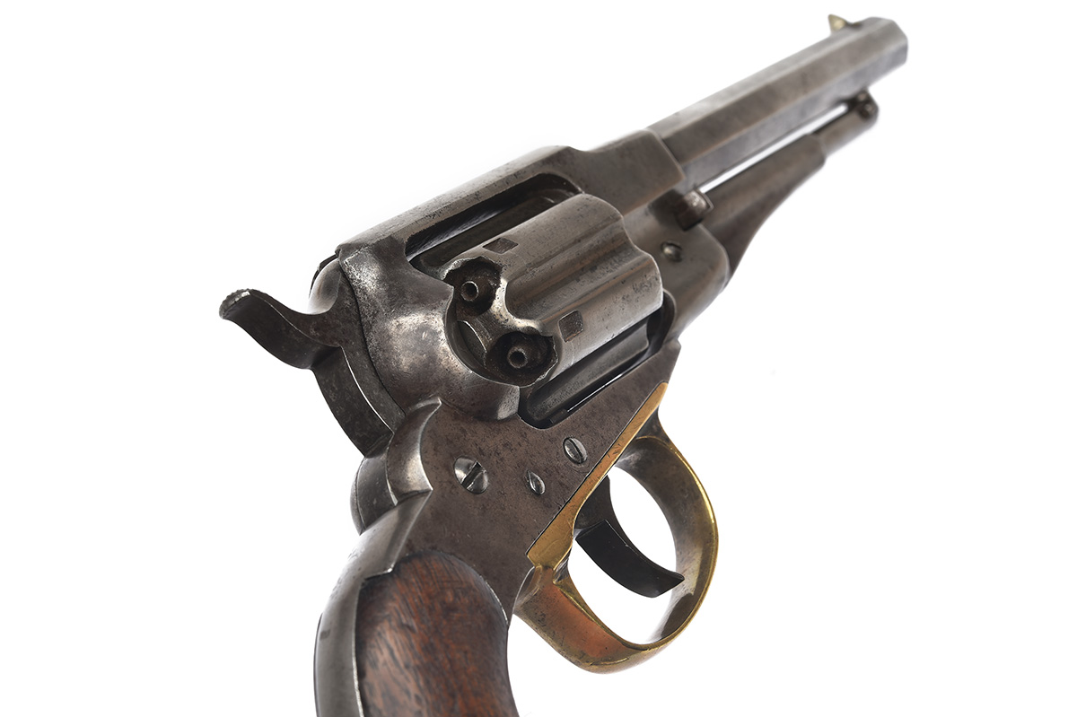 circa 1863, with octagonal 6 1/2in. barrel marked on the top-flat 'MANUFACTURED BY REMINGTONS, ILION N.Y.' (rubbed) over a line of patents to '1859' (only partially legible), white metal conical fore-sight, sighting groove to the top-strap, six-shot cylinder with full-length flutes, plain iron frame, brass trigger-guard, two-piece smooth walnut grips and hinged under-barrel rammer, the whole stained with areas of re-finishing and mild pitting