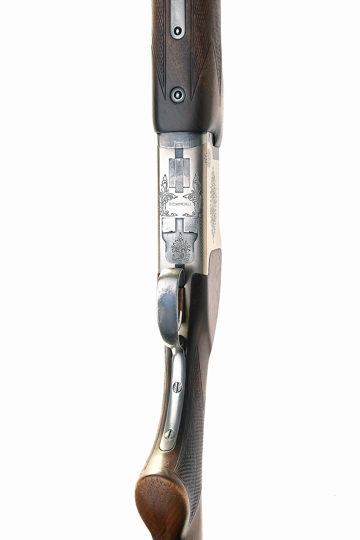 B.C. MIROKU 12-BORE SINGLE-TRIGGER OVER AND UNDER EJECTOR, serial no. 3331608, circa 1980, 28in. nitro barrels with 10mm ventilated matt top-rib, 2 3/4in. chambers, bored approx. imp. cyl. and 1/4 choke, hold-open toplever, manual safety with integral barrel selector switch, border and partial scroll engraving, 14in. pistolgrip stock including 5/8in. rubber recoil pad, weight 7lb. 10oz.