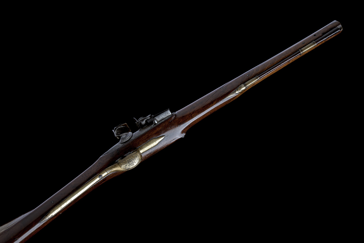 circa 1770, probably cut-down from a pre-existing officer's fusil, with two-stage round iron 17in. barrel, the top marked 'TEMPLE BARR LONDON', moulded band at breech bisected by a narrow sighting groove extending onto the engraved top-tang, rounded lock with raised borderline and signed 'NEWTON' within an embellished banner below the shallow rainproof pan, swan-necked cock, moulded frizzen with engraved bridle, feathered tip to the frizzen-spring, walnut hand-rail full-stock, engraved brass furniture except for the 'Elliot' style side-plate, ramrod throat and single pipe, period ramrod (frozen)