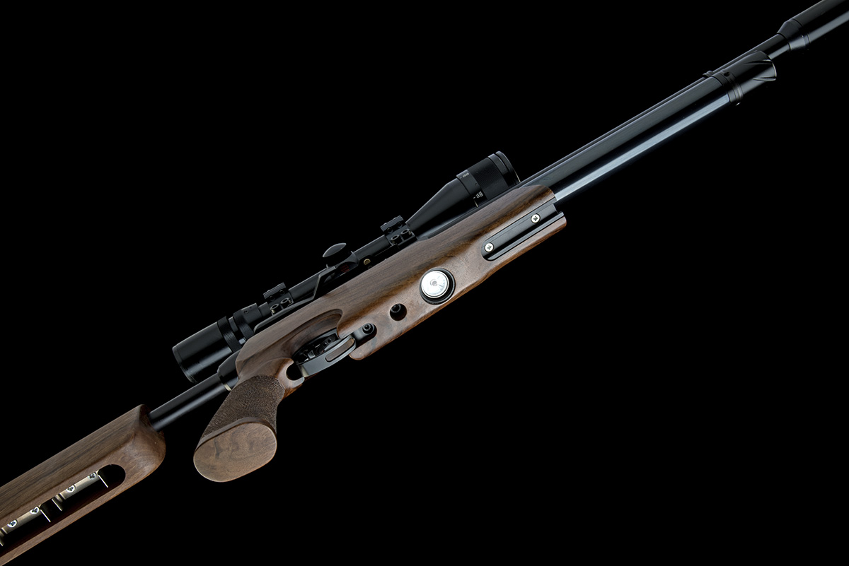 recent, with shrouded 23in. barrel including detachable sound moderator, side-lever operated receiver with detachable magazine (two included), blued under-barrel air reservoir with pressure gauge, detachable metal butt-stock with walnut ambidextrous cheek-piece, walnut pistol-grip fore-stock with accessory rail, in its dedicated abs plastic case with bipod, instructions and muzzle cap (no filling accessories), tested and appearing very little used, fitted with a Simmons 4-12x40 telescopic sight