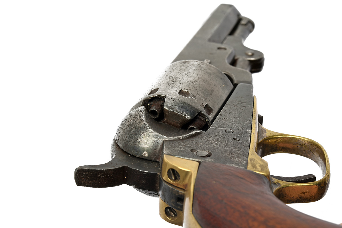 A .36 PERCUSSION MANHATTAN 5-SHOT SERIES III 'NAVY' REVOLVER, serial number 28903, circa 1862, with 4 in. sighted octagonal barrel, open frame, 12-stop cylinder, walnut grips, worn with pitting and scrubbed of all engraving and markings, replaced grips, 9 in. overall length