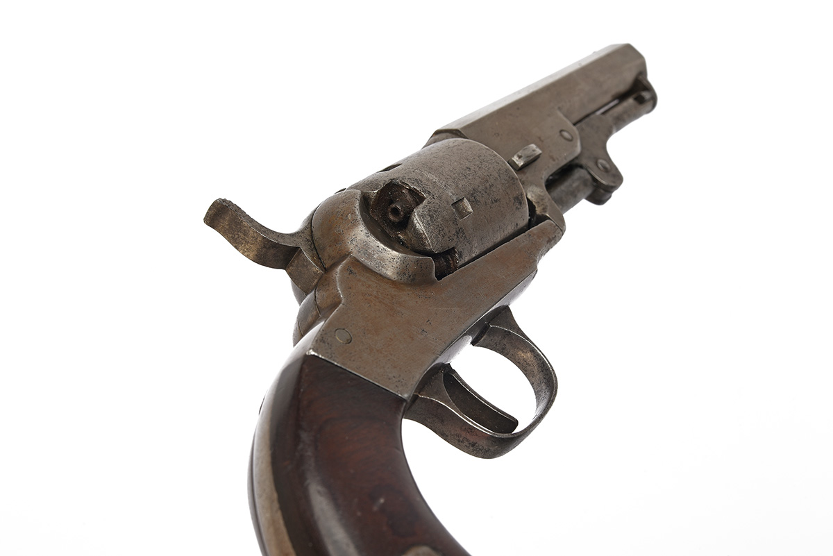 Provenance: The noted gun historian Norman Flayderman notes in his 9th Guide To American Firearms that a handful (three at the time of writing in 2007) of Manhattan series 1 pocket revolvers had been found without engraving and with only five cylinder stops as opposed to the normal ten. All have serial numbers below 500. Whether this is one of the three recorded by Flayderman or whether it is a new discovery has not been established