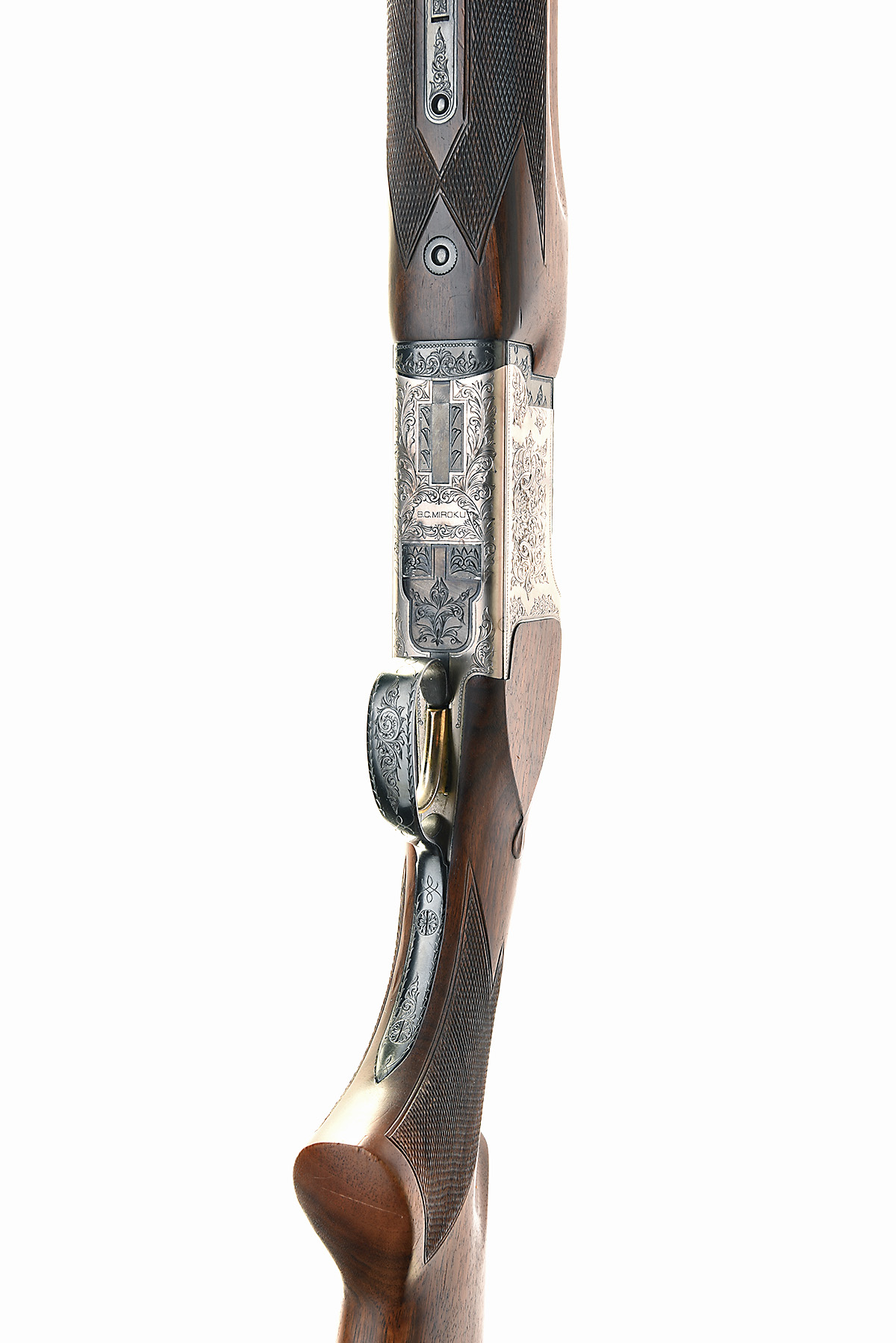 MIROKU FIREARMS MFG. CO. 12-BORE SINGLE-TRIGGER OVER AND UNDER EJECTOR, serial no. 80294PZ, dated 1981, 28in. nitro barrels with 10mm ventilated matt top-rib, 2 3/4in. chambers, bored approx. true cyl. in both, hold-open toplever, manual safety with integral barrel selector switch, gold-washed single trigger, beaded border and acanthus scroll engraving, bright finish, 14 1/4in. pistolgrip stock including buttplate, weight 7lb. 11oz.