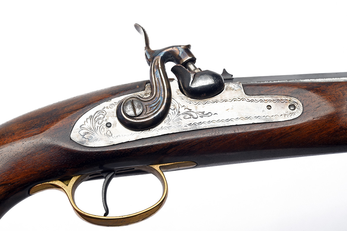 A REPRODUCTION .45 PERCUSSION 'ARMI SPORT' PISTOL MODEL 'KENTUCKIAN', serial no. 70681, with 9 3/4in. blued octagonal barrel, colour hardened engraved lock, walnut full-stock, brass trigger guard and under rib, wood ram rod