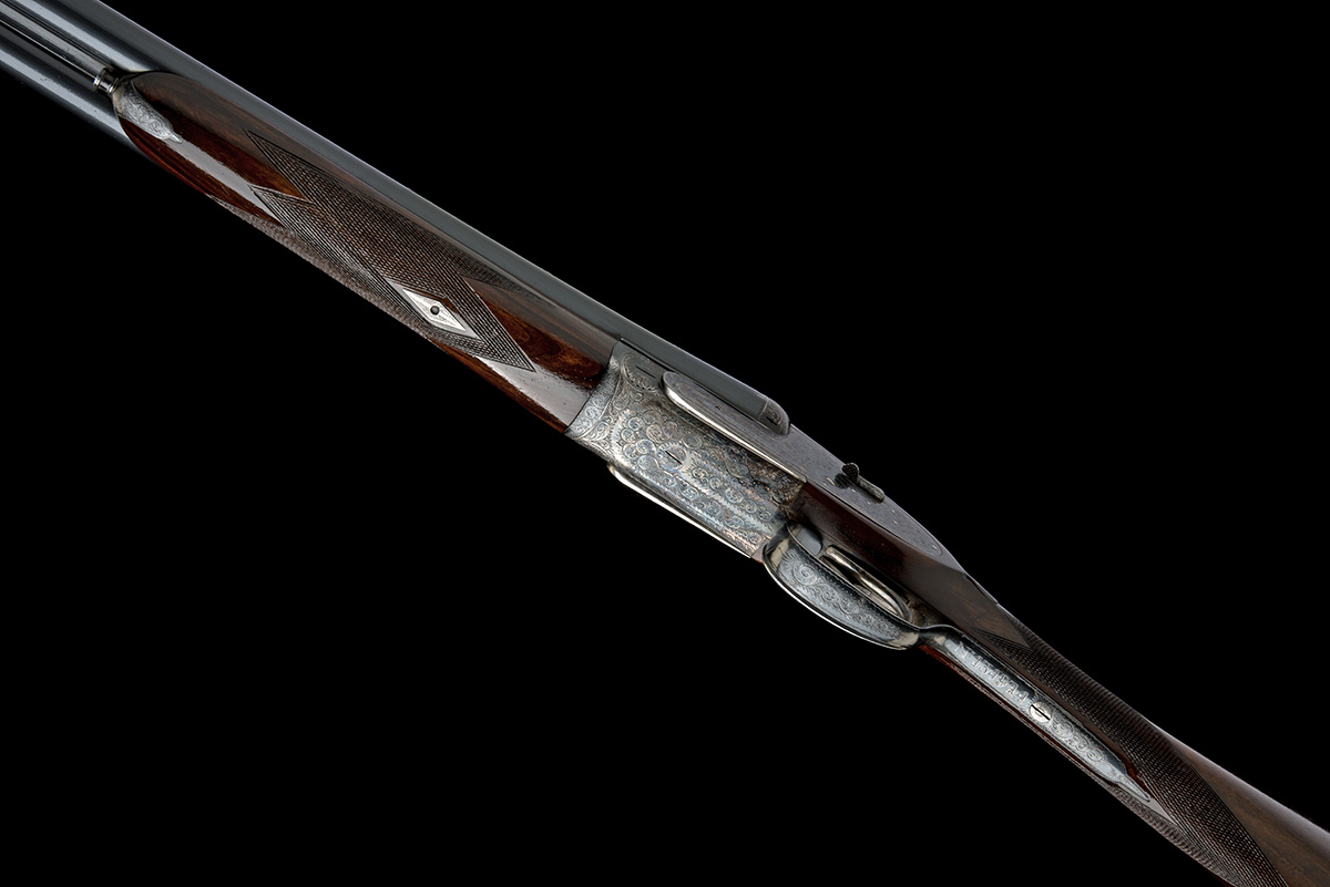 for 1960, 28in. nitro chopperlump barrels, 2 3/4in. chambers, bored approx. imp. cyl. and 1/2 choke, treble-grip action with hidden third bite, removable striker discs, engraved arcaded fences, automatic safety, hand-detachable lockplates, gold-inlaid cocking-indicators, rolled-edge triggerguard, acanthus scroll engraving, retaining much original colour-hardening and finish, 14 3/4in. stock, weight 6lb. 5oz.