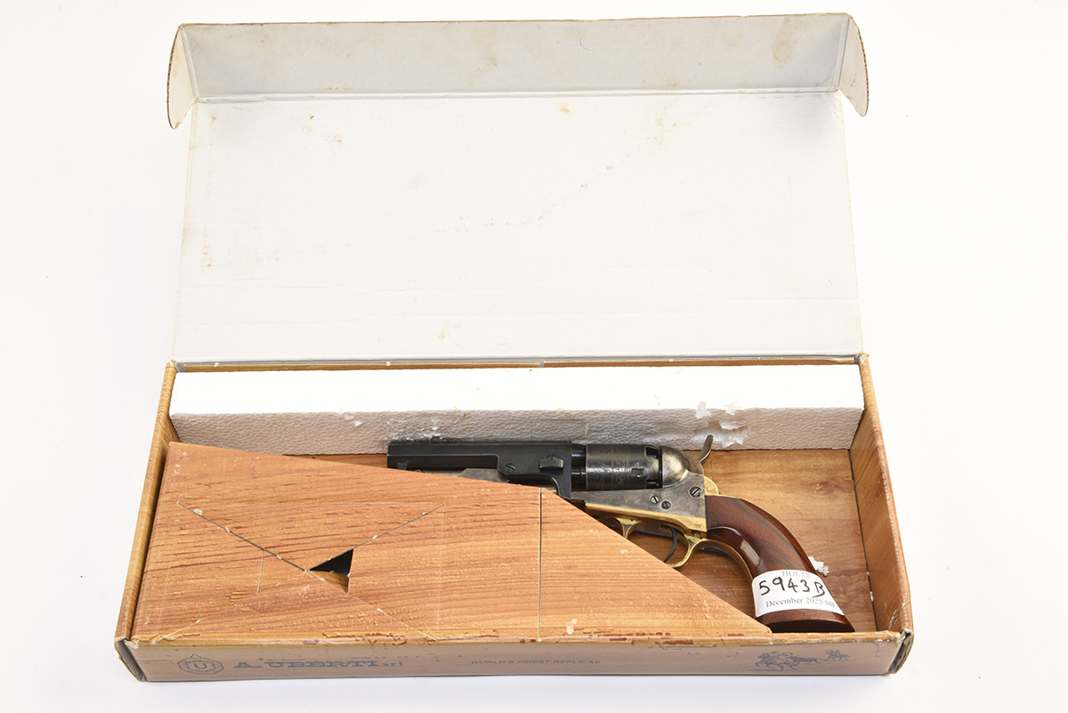 A BOXED REPRODUCTION .31 PERCUSSION 'UBERTI' REVOLVER MODEL 'COLT POCKET' USED IN THE FILMING OF COLD MOUNTAIN, serial no. A29224, with 4in. blued octagonal barrel, colour hardened open frame and ram rod, blued engraved cylinder, brass trigger guard and grip-strap, smooth walnut grips in makers carton, together with letter of provenance from Zorg Limited (Film Armourers), dated April 2021 stating "Please accept this document as confirmation that this item, serial no. A29224, was one of the weapons shipped to Romania to be used in the filming of 'Cold Mountain', starring Jude Law and Nicole Kidman, although it is not possible to specify which particular actor used any specific weapon"