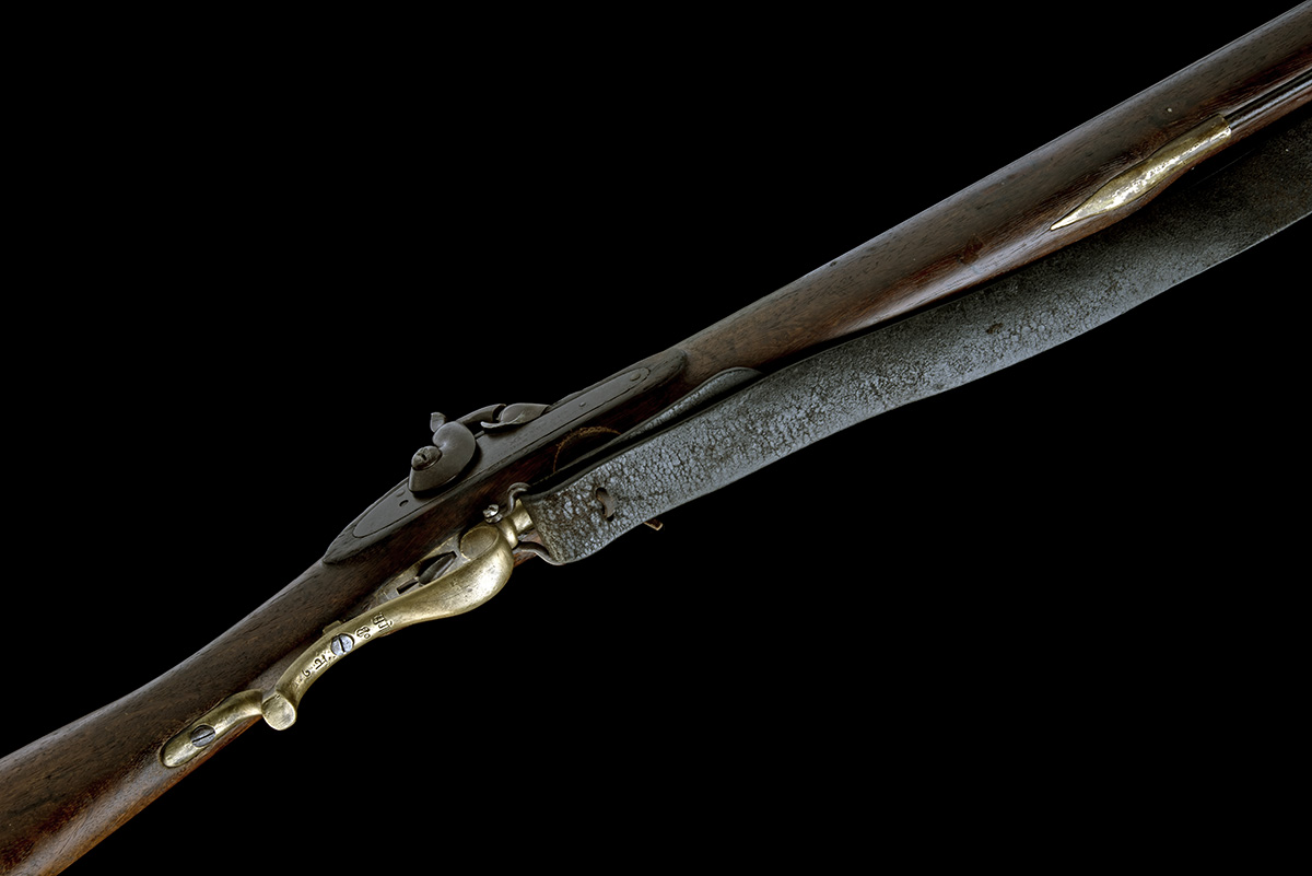 1840s, with 39 1/2in. sighted barrel with Birmingham proofmarks, plain lock signed 'Manton & Co. / London & Calcutta', full stock, brass furniture, sprung bayonet catch, original iron rammer, sling swivels and period black leather sling, triggerguard and buttplate tang with Farsi script