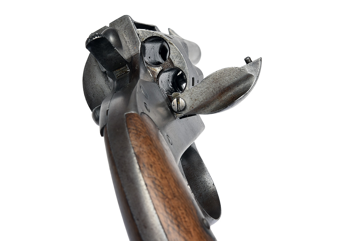 circa 1887, with octagonal to round 4 5/8in. barrel, integral pinched blade fore-sight, sighting notch to rear of top-strap, solid frame, the left side below cylinder with an oval maker's stamp, 'church window' fluted six-shot cylinder, side safety, single action mechanism and walnut 'kidney-bean' grips with traces of chequering, the whole cleaned of finish, with certificate of proof
