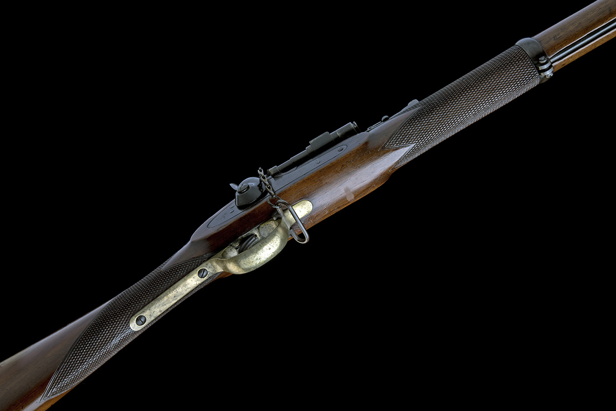 dated for 1865, with 36 1/2in. barrel, block and blade fore-sight, elevating ladder rear-sight, flip-open breech with solid thumb-piece, the top of breech signed 'BSA Co.' and 'SNIDER PATENT', plain lock signed and dated centrally and with 'V.R.' and crown device to tail, walnut full-stock chequered at the wrist and fore-end, brass furniture except for three iron barrel-bands and jag-ended clearing rod