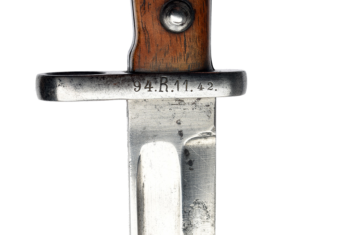A GOOD GERMAN MODEL 1871/84 MAUSER BAYONET BY SOEMMERDA, dated 1887, with 10 in. single-edged blade fullered on each side, ricasso marked 'Soemmerda', blade back with crown over 'W / 87' plus inspection mark, cross-guard regimentally marked '94.R.11.42', riveted wooden grips, pommel with two further inspection marks, with its brown leather scabbard with steel fittings, the locket with matching regimental details, plus brown leather frog