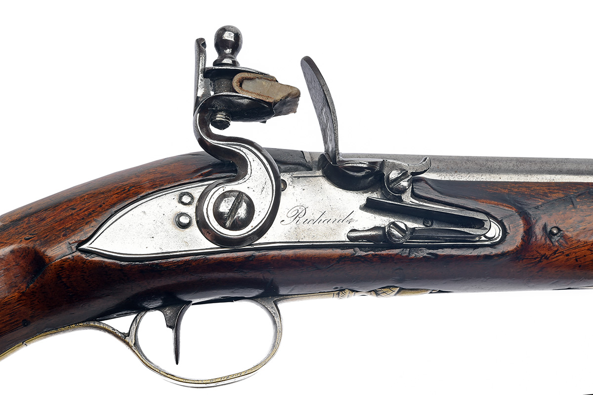 circa 1770, with round 9in. barrel in the white, the top at breech marked with private proofs (rubbed)'7 CHARING CROSS LONDON' (refreshed), moulded band at breech, plain flat borderline engraved lock, 'RICHARDS' signature below the pan, borderline engraved cock, unbridled frizzen, walnut full-stock with semi slab-sided grip, brass furniture, engraved trigger guard bow with acorn finial and horn-tipped ramrod, well refinished